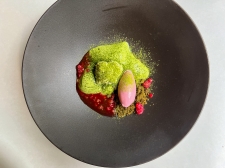 *抹茶のブランマンジェ 白あんのエスプーマ、フランボワーズのソース Matcha blancmange, white bean paste espuma, raspberry sauce