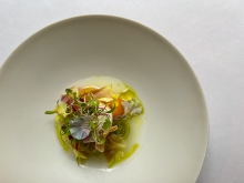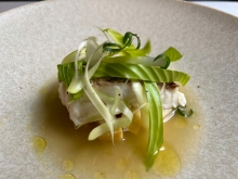 桜鯛のヴァプール、昆布、鶏、野菜、魚のお出汁と筍の温かいスープ仕立て 青文字の香り